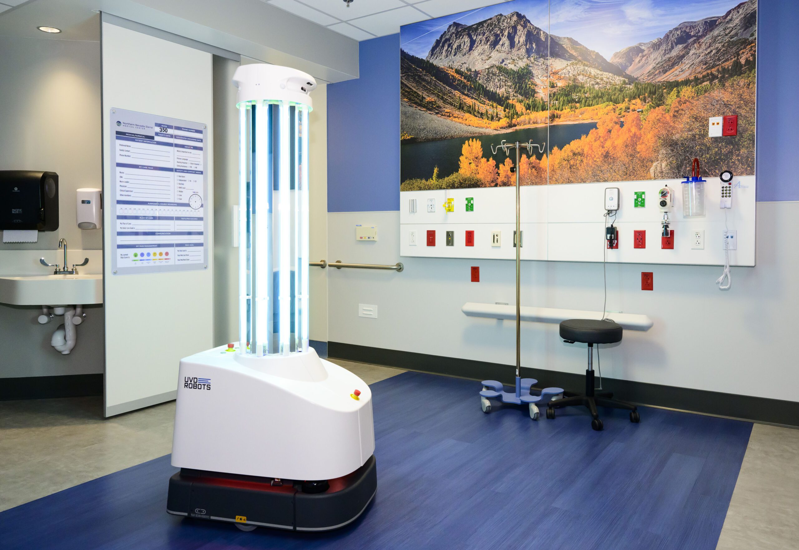 Two men walking in hallway with tall robot